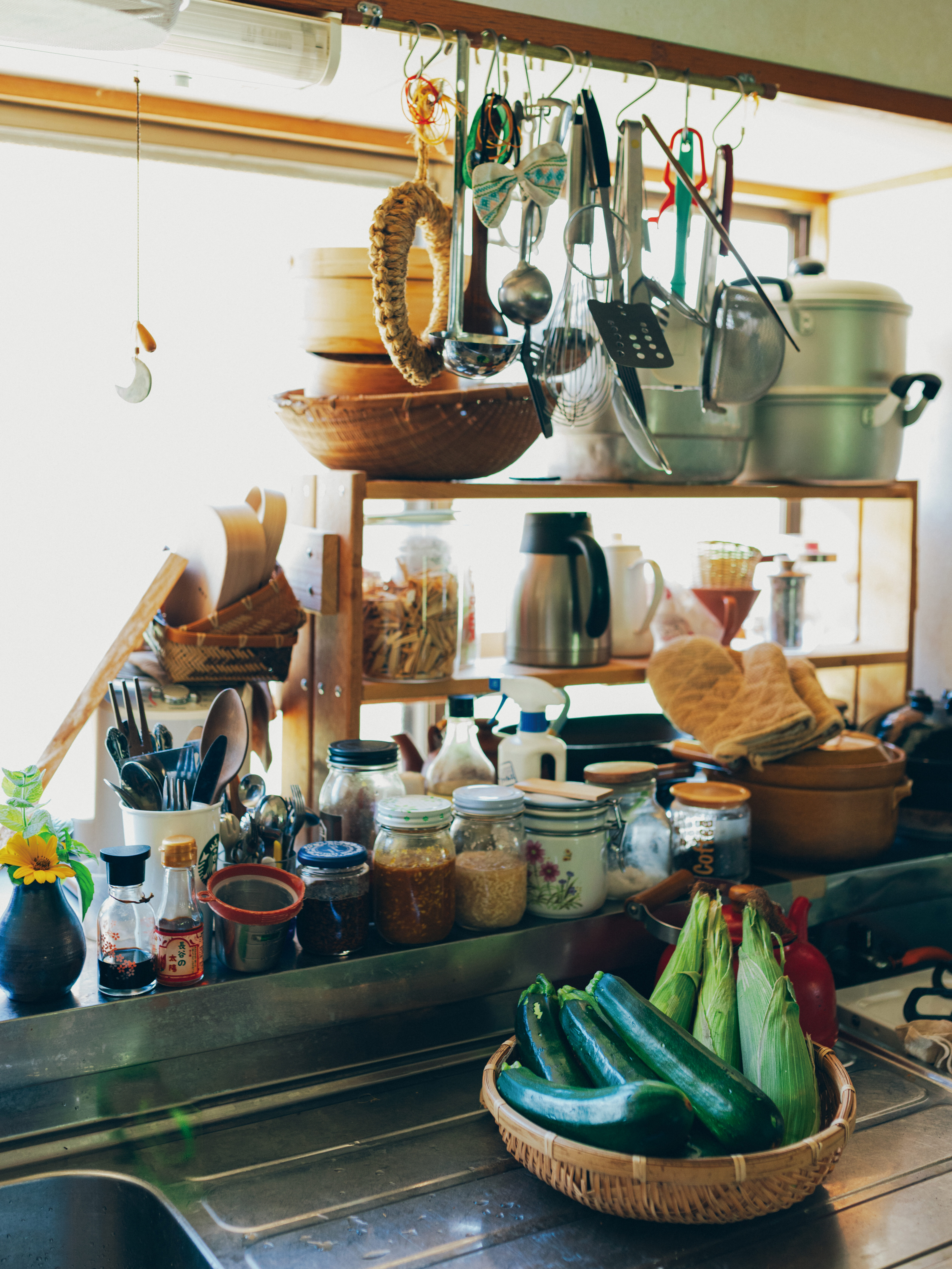 宮内家の台所には、夫の仕事先である農家から届いた立派なズッキーニと、家の畑のとうもろこしが 。「この一帯は土地が肥沃だそう。だからでしょうか、都会では考えられないくらい立派な野菜が育ちます」
