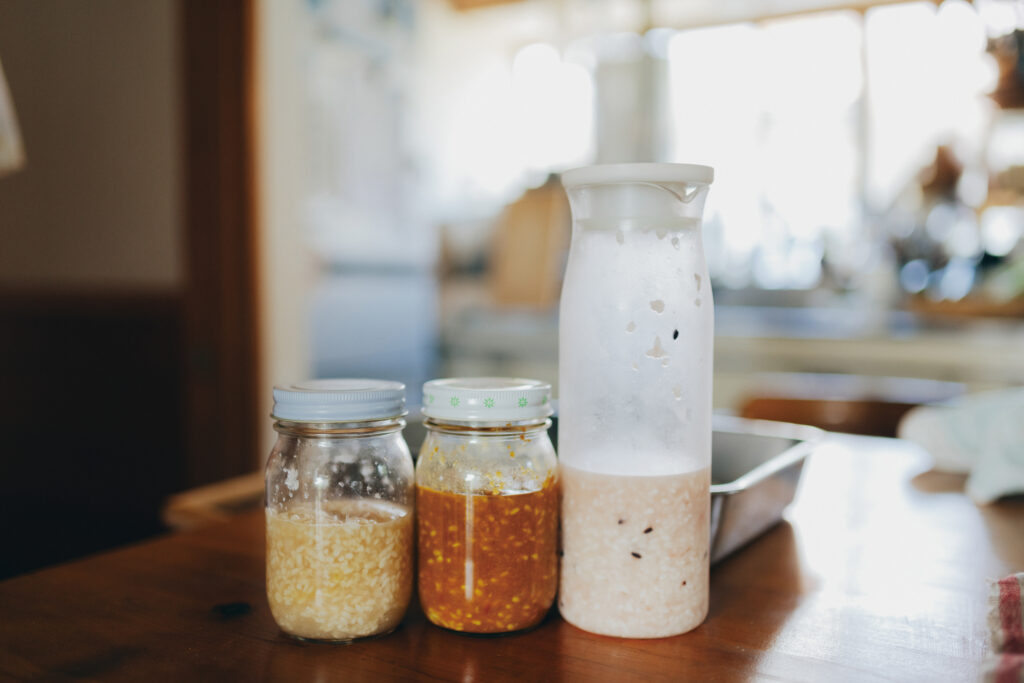 写真右から、日々愛飲している手づくり麹の甘酒と、スパイスと仕込んだ「カレー麹」、「玉ねぎ麹」はコンソメ代わりに使えて便利。