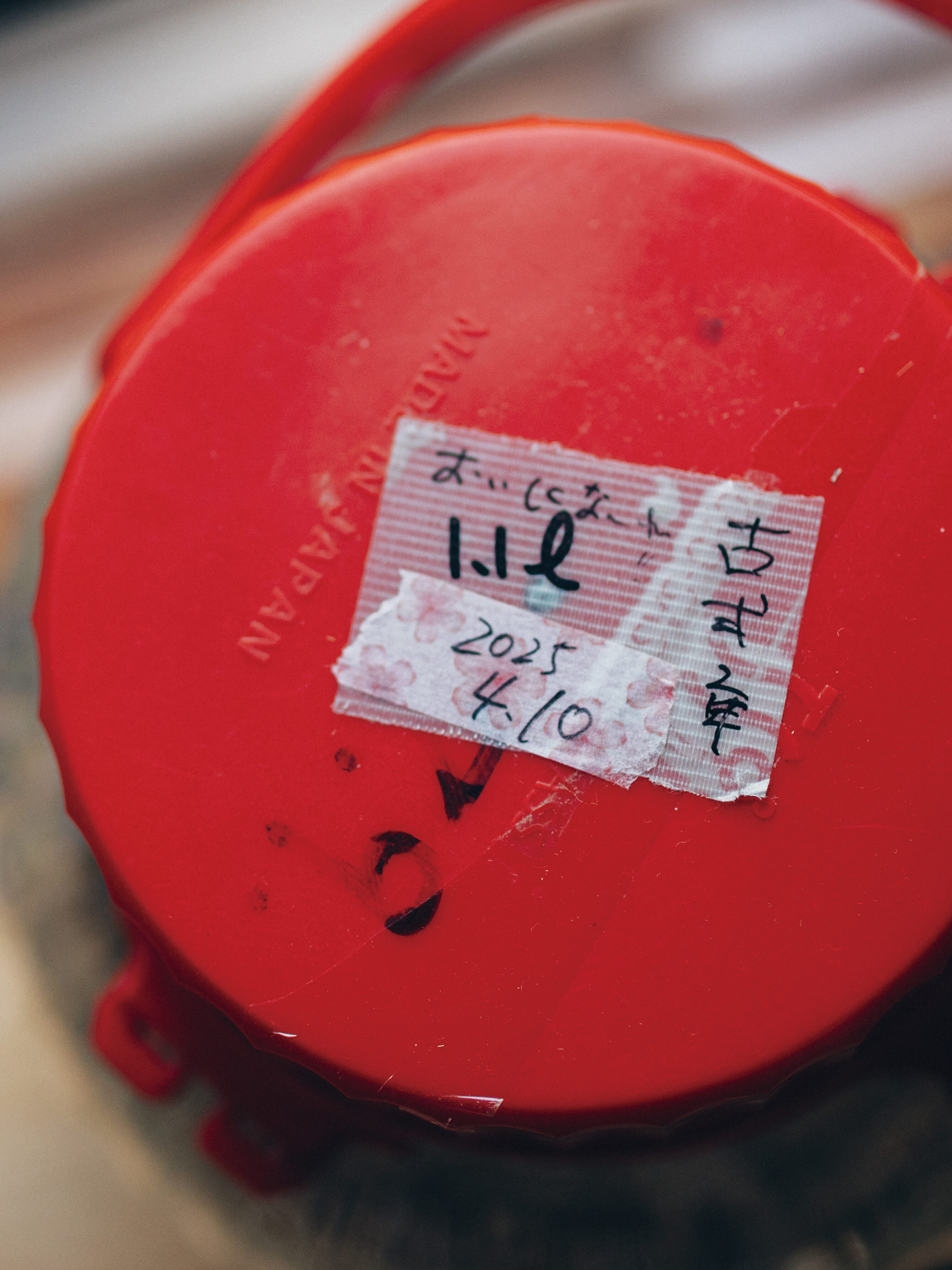 毎年のように仕込んでいる「古式醤油」の瓶には「おいしくなーれ」の願いを書いて。