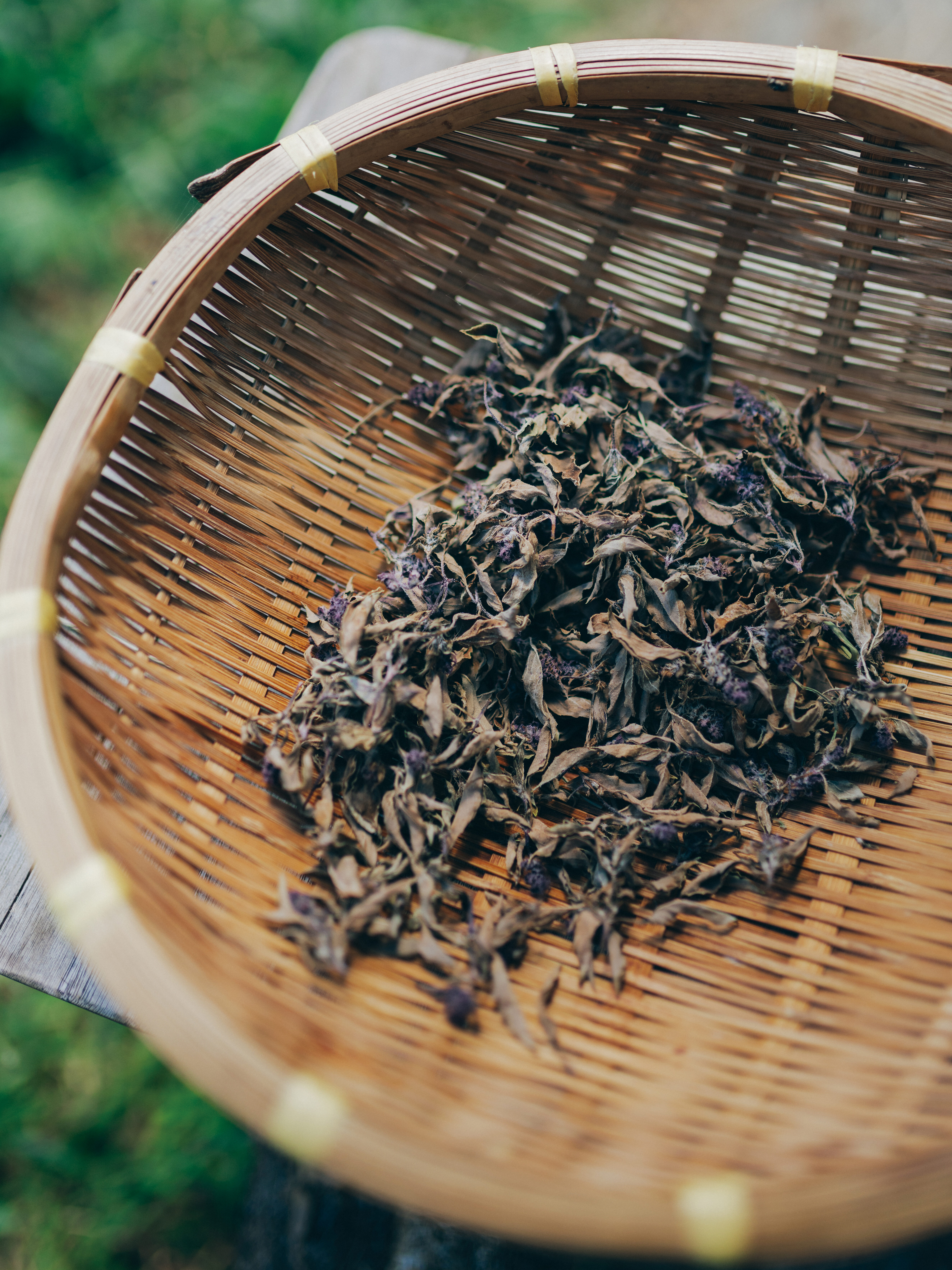 庭で乾燥中のホーリーバジル。「トゥルシーとも呼ばれるこのハーブの種は、八ヶ岳の友人からいただいたもの。こうして干してお茶として味わっています」