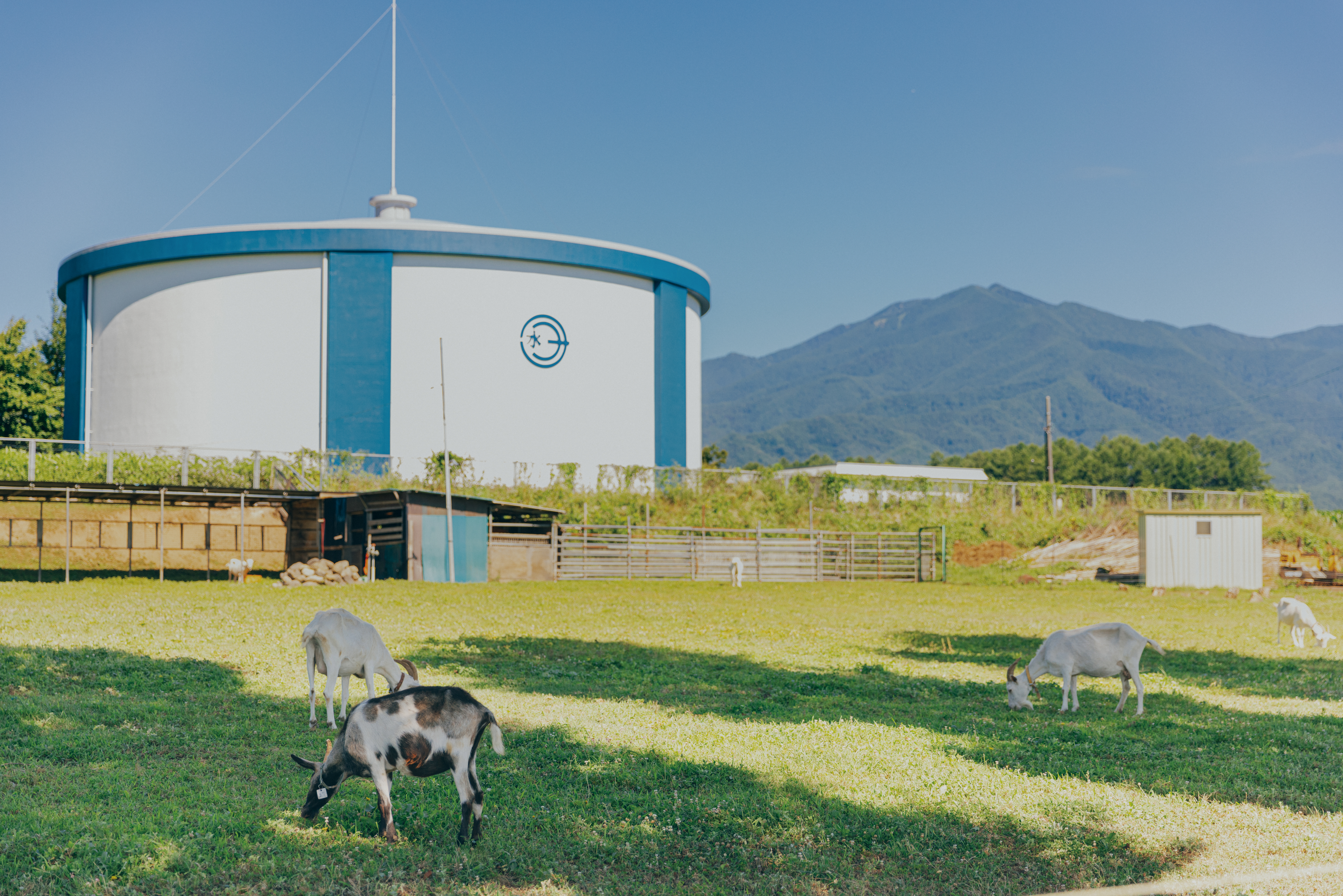 産地直売所の先駆的存在「産直市場 グリーンファーム」で人気の動物ひろば。のんびりと草をはむヤギたちはなんとレンタル可能。除草などに活躍している。