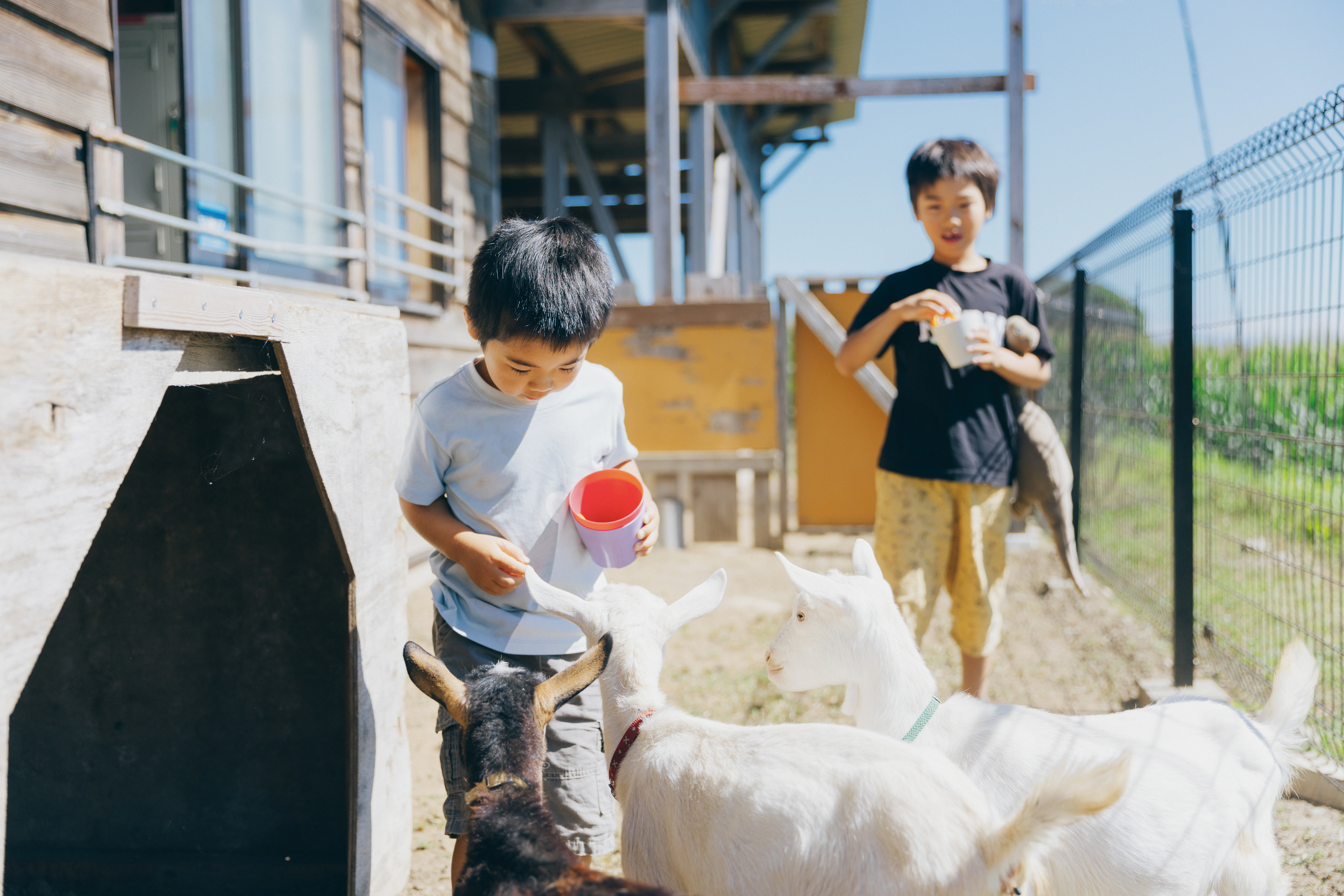 「産直市場グリーンファーム」でヤギにエサをあげる子どもたち。