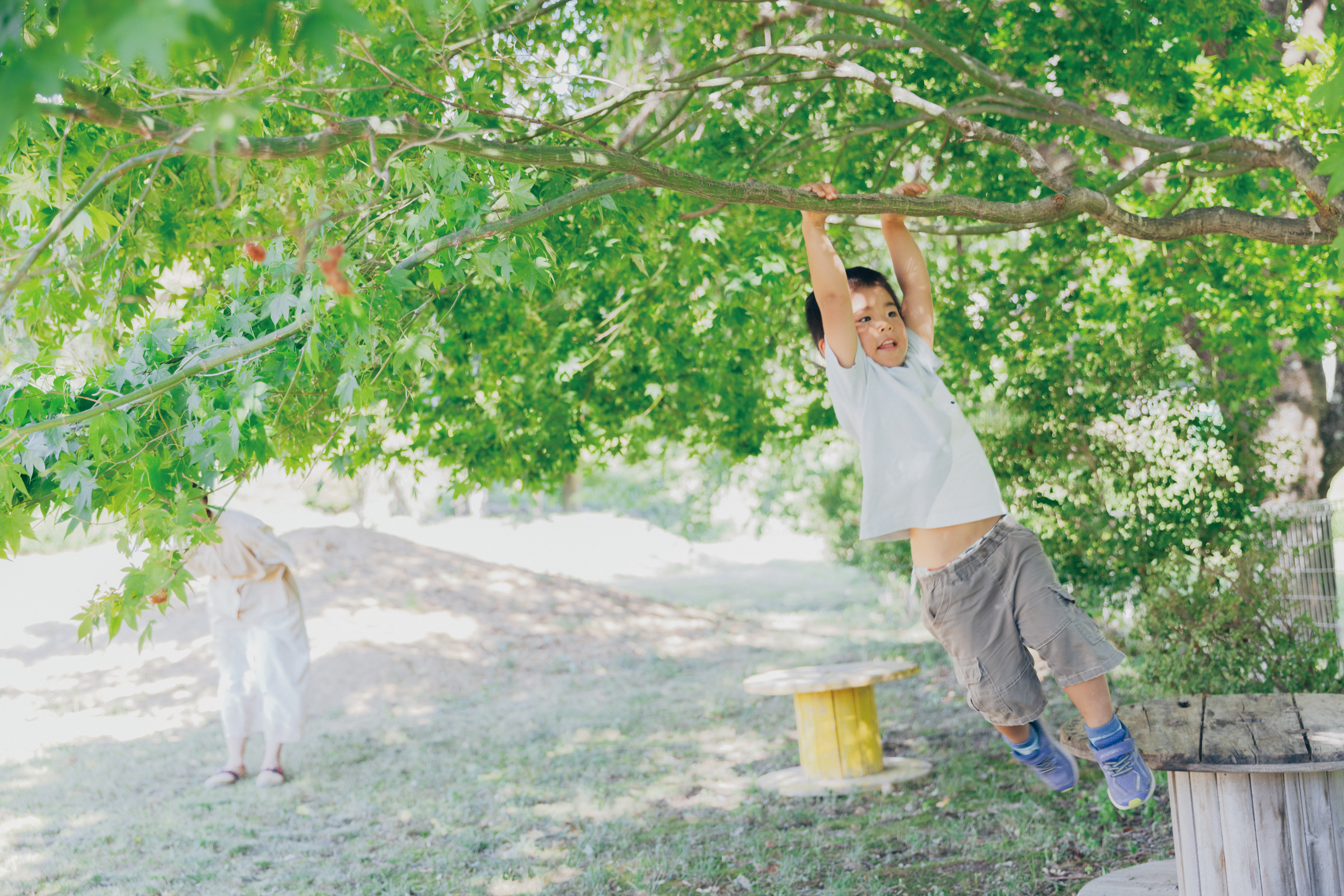 園庭のいつもの遊び場で木登りを披露。「神奈川に暮らしていたころから活発でしたが、遊びがさらにダイナミックになりました」