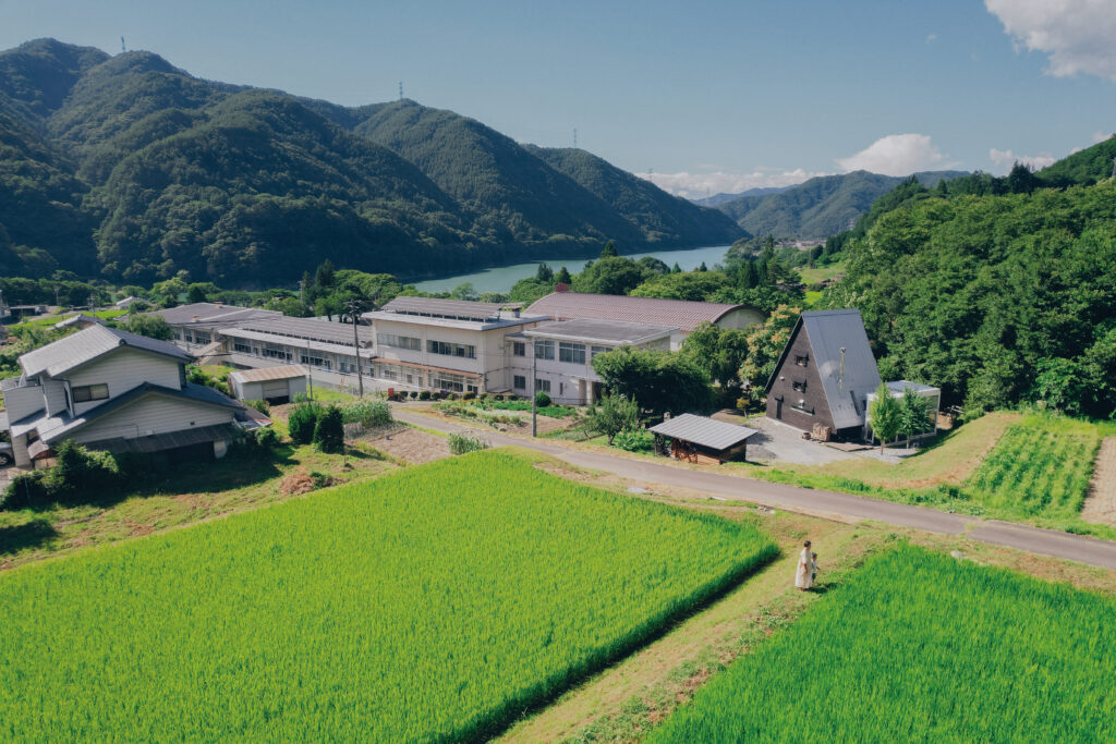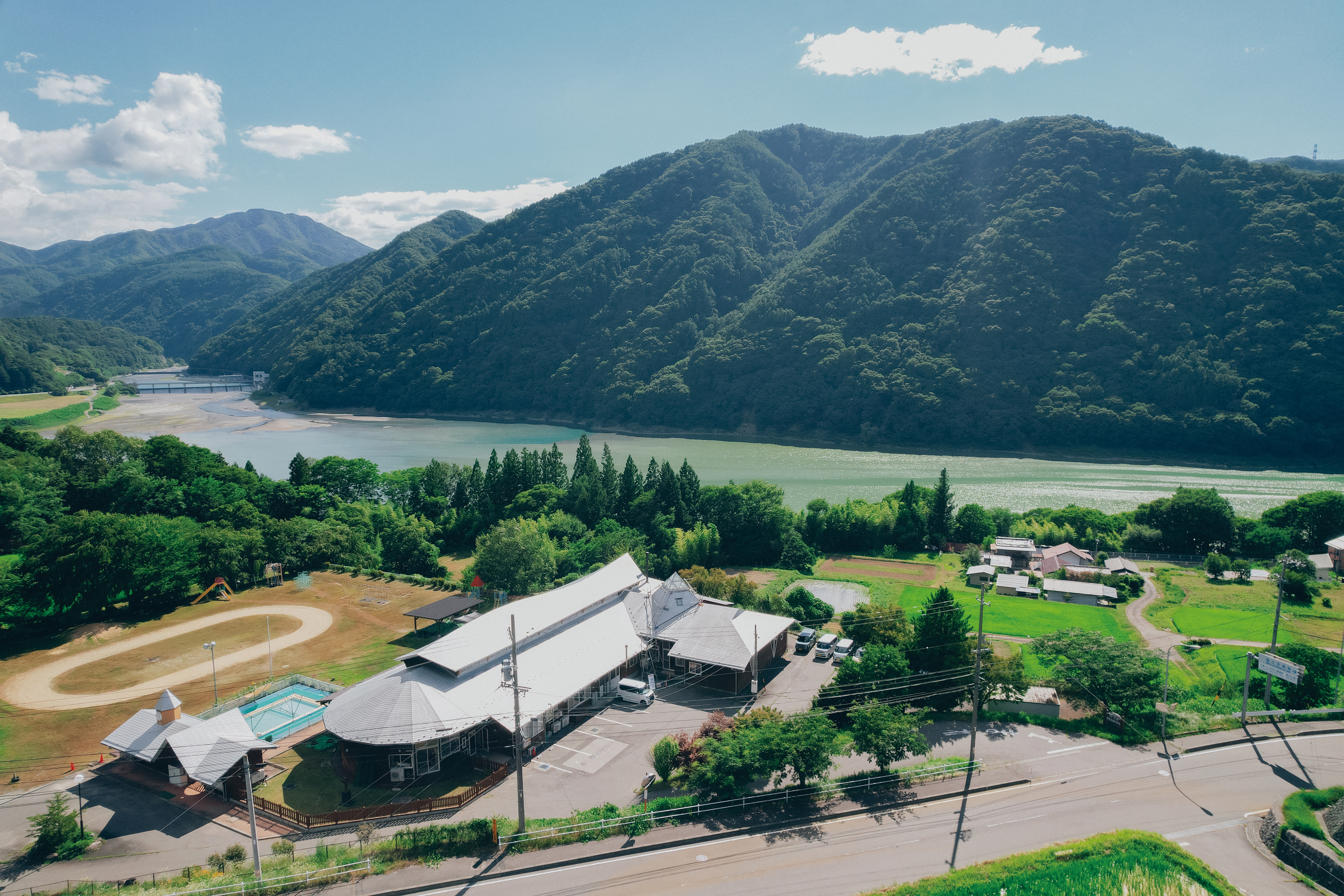 宮内家の次男が通う伊那市立長谷保育園の遠景。春は桜、秋は紅葉の名所としても知られる美和ダムのほど近く、クジラの背を思わせる屋根がシンボルの同園は、「そらとぶくじら保育園」の愛称で親しまれている。