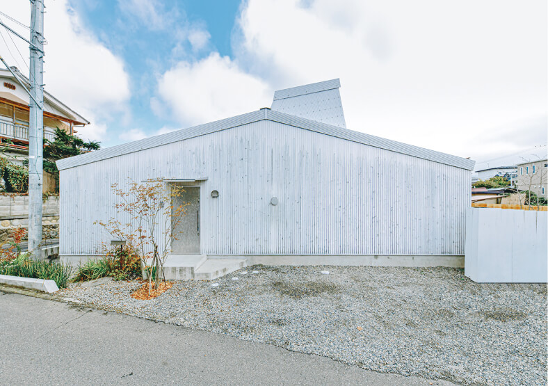松本の中心部にほど近い住宅街。「ペッタンコハウス」という名のとおり、周囲の建物よりひときわ低く、地面に張り付くような独特のフォルムを見せる白い家が、工芸家の前田大作さんと、幼なじみの建築家・田辺雄之さんのコラボレーションによる住まいだ。
