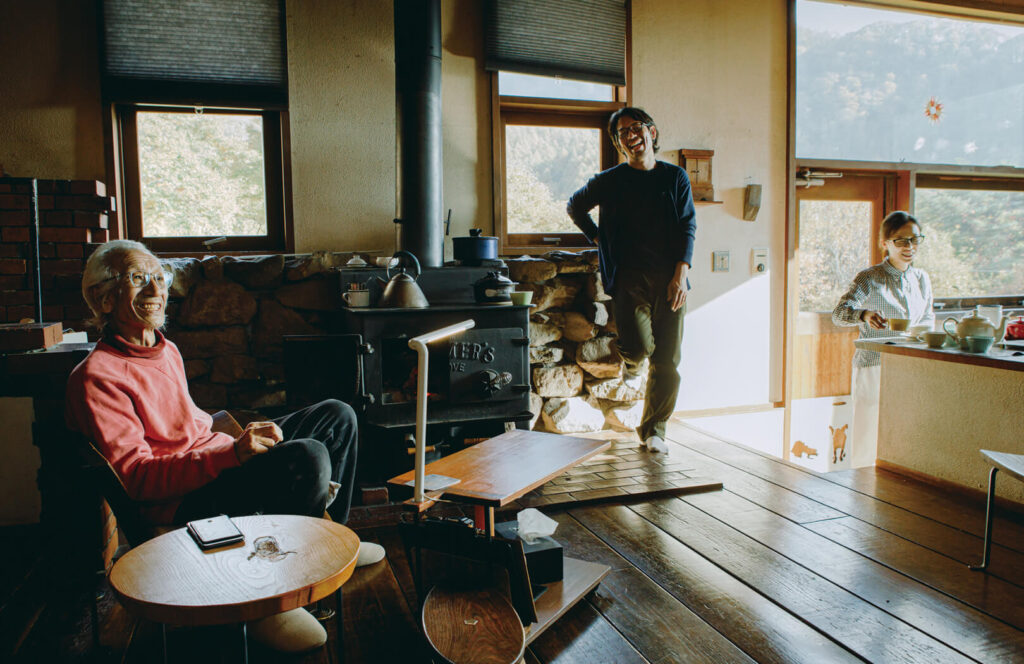 ストーブの前で談笑する前田さん父子。オリジナルのローチェアやワゴンテーブルを置いたリビングは、一段低くなったキッチンとも会話が弾む。