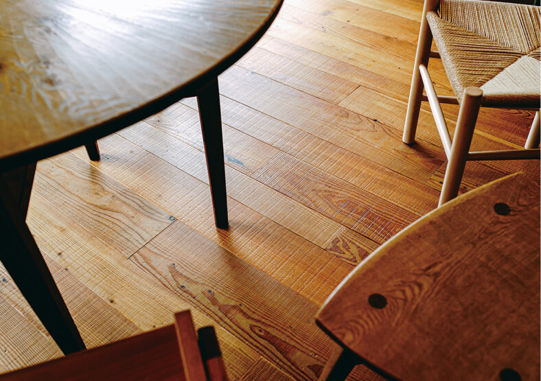地場産のカラマツをランダムな幅で張った床は、製材時の鋸目のまま浮造り(うづくり)で仕上げた。伝統の木工技法だが、陰影が美しく、足触りもとても良い。
