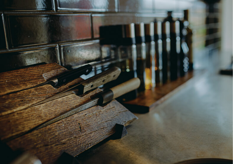 信州の唐松や松を材料に、前田さんが設計・製作したオリジナルキッチンは、異なる木材を用途に応じて組み合わせ、精緻な箱家具をつくる江戸指物の技法が使われている。天板にはぶ厚い無垢材や墨色のモールテックス、ステンレスを使用。水や油、傷をも受け止め、使うほど表情豊かになるキッチンだ。